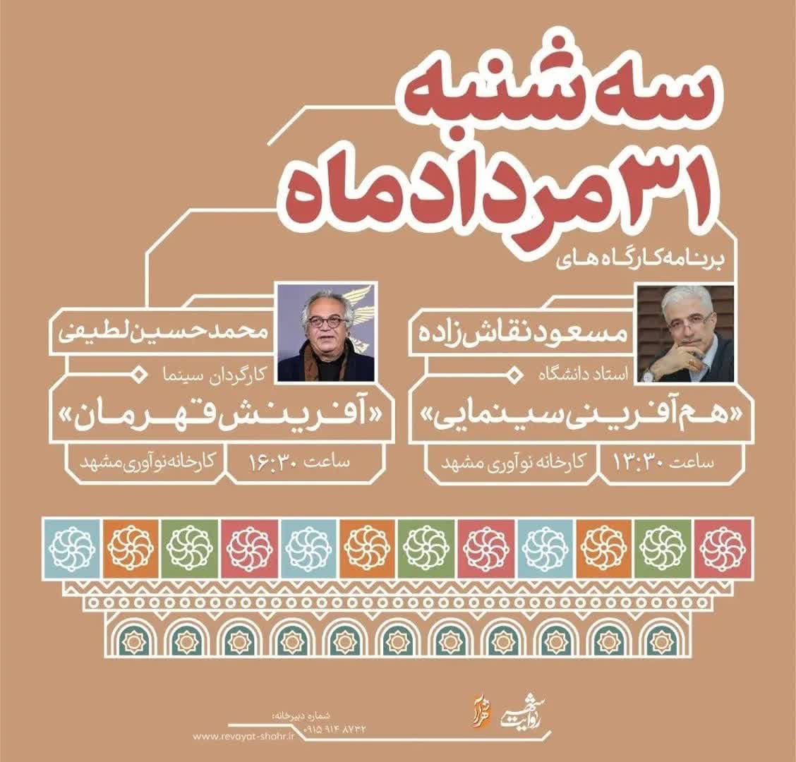برنامه کارگاه‌های روز چهارم و پایانی رویداد ملی هم‌آفرینی فیلمنامۀ مستند و خرده روایت با حضور آقاین نقاش زاده و لطیفی در کارخانه نوآوری مشهد.