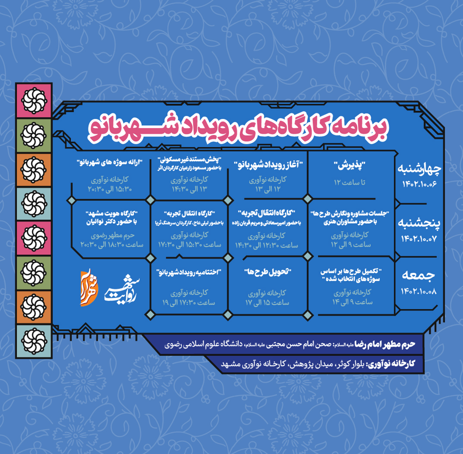 📍 در روز دوم، جلسات مشاوره و نگارش طرح ها با حضور مشاوران هنری، کارگاه انتقال تجربه با حضور امیر سعادتی و مریم قربان زاده، کارگاه انتقال تجربه با حضور لیلی عاج کارگردان سرهنگ ثریا و در آخرین کارگاه از دومین روز رویداد، کارگاه هویت مشهد با حضور دکتر نوائیان در محل حرم مطهر برگزار خواهد شد.