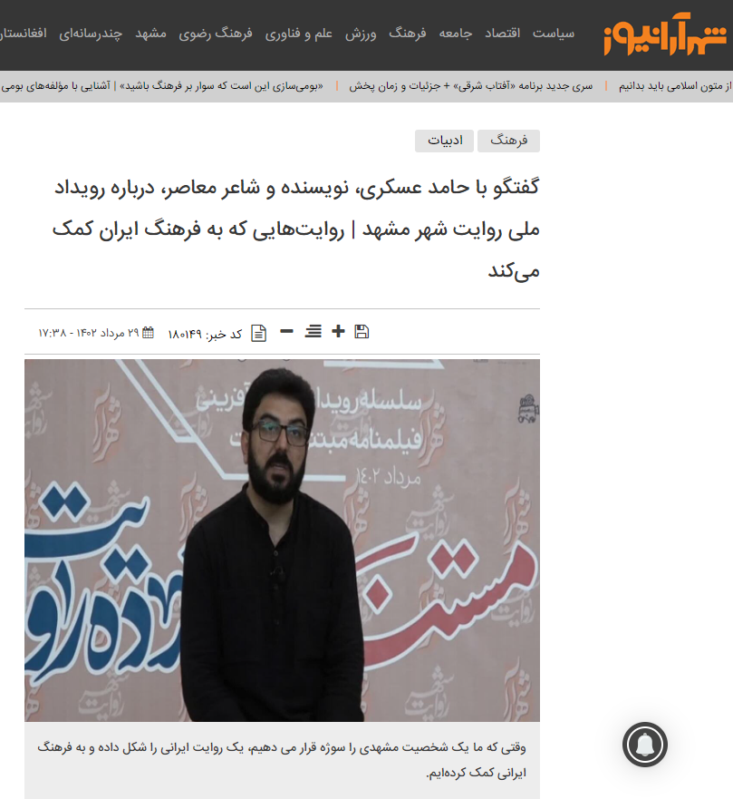 به گزارش دبیرخانه روایت شهر و به نقل از شهرآرا، حامد عسکری که برای برگزاری «کارگاه مولفههای بومی نویسی در روایت»، در مشهد حضور پیدا کرده است، با اشاره به اهمیت رویداد ملی روایت شهر میگوید: وقتی میگوییم کلانشهر، این کلان بودن به معنای کلان بودن فرهنگ، معماری، هنر و گستردگی عقاید و سلیقههای مختلف است. بنابراین برگزاری رویداد روایت شهر در کلانشهر مشهد اتفاق مبارکی است. در وقت خوبی هم اتفاق افتاده و چه بسا که دیر هم اتفاق افتاده باشد. اما باید منتظر ماند و گذاشت ایدهها، فکرها و خلاقیتها شلاق بخورند تا ببینیم در ادامه اتفاق مبارکی خواهد افتاد یا نه!